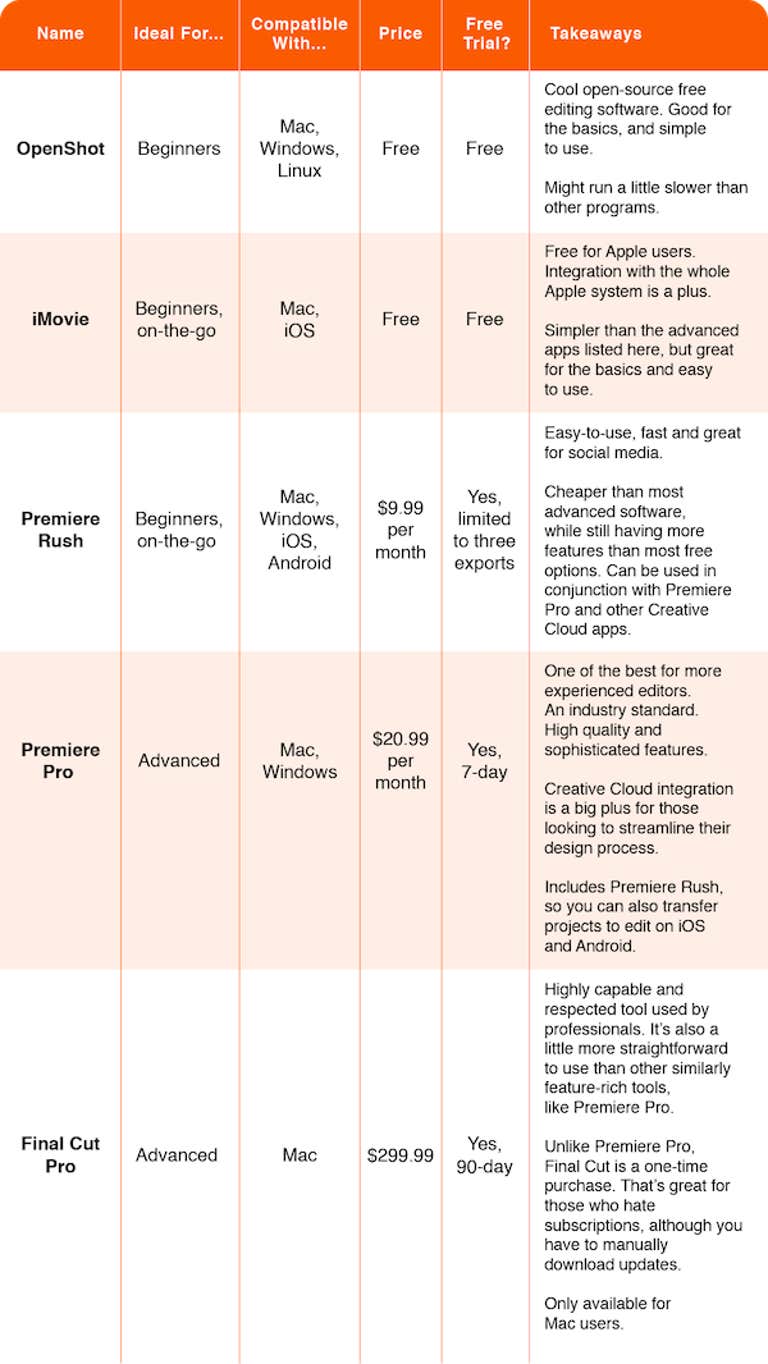 If you have an Apple computer and just want to get started without investing more money, iMovie will handle most basic edits. For something with more capability, try Adobe Premiere Elements for beginners or Adobe Premiere Pro if you already have some experience editing. You can also check out DaVinci Resolve, which offers both a free version and a paid upgrade
